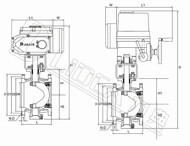 | 规格型号 | DN | L | D | H | H1 | H2 | L1 | W | E-电动头 |