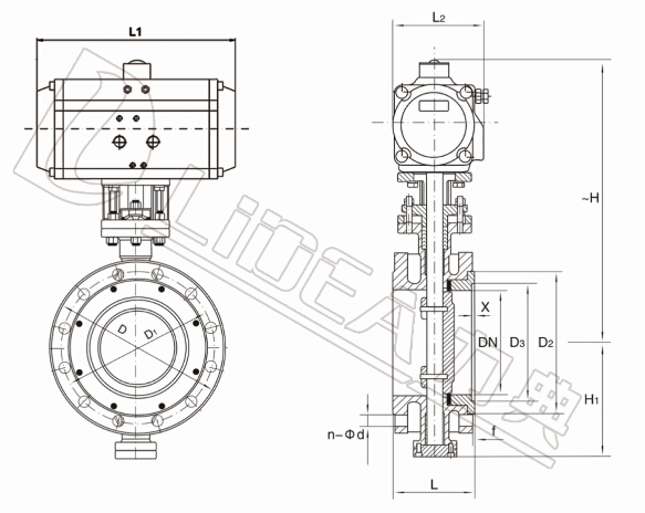 | 型号 | DN | L | L1 | L2 | ~H | H1 | D | D1 | D2 | f | n-Φd | 执行器型号 |
