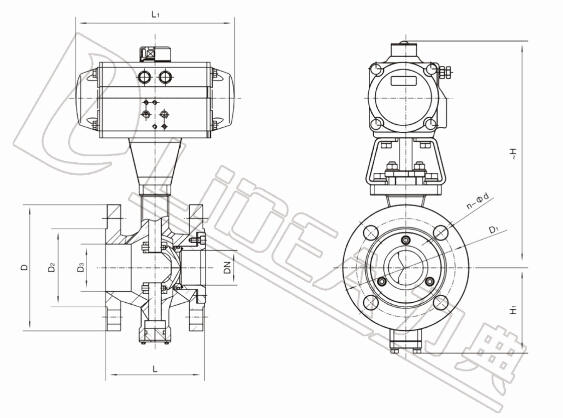 | 型号 | DN | L | L1 | ~H | H1 | D | D1 | D2 | D3 | C | F | n-Φd | 执行器型号 |