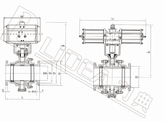 | 型号 | DN | in | L | L1 | ~H | D | D1 | D2 | C | F | n-Φd | 执行器型号 |