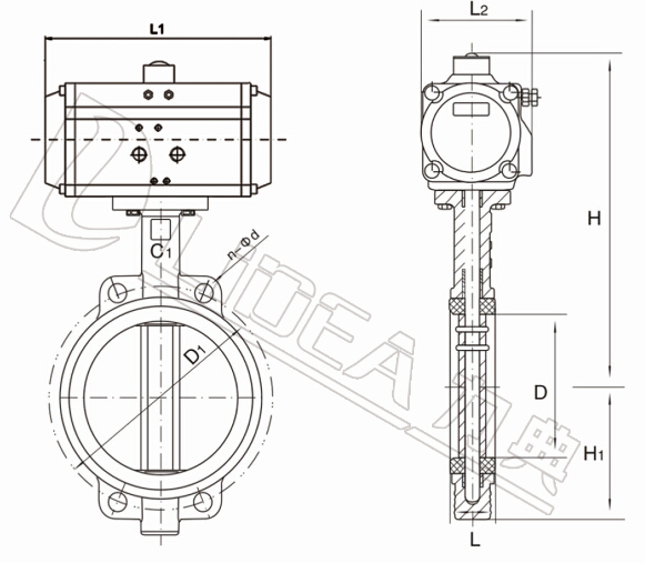 | 型号 | DN | L | L1 | L2 | ~H | H1 | D | D1 | n-Φd | 执行器型号 |
